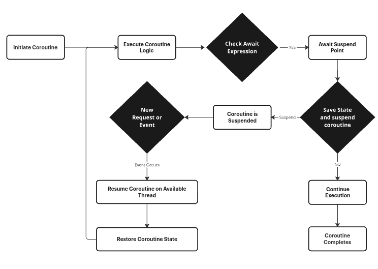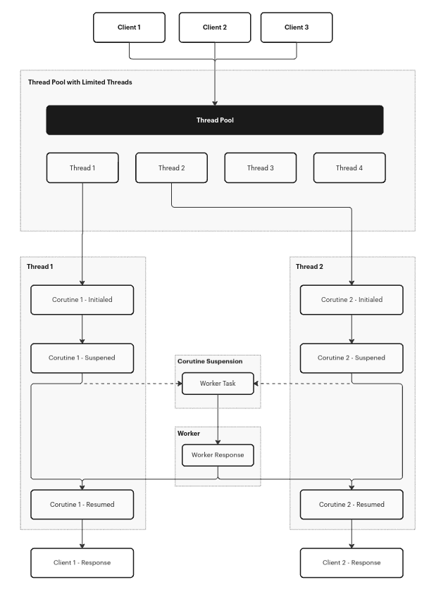 To optimize this process, we employ a strategy where a thread alternates between assigning tasks to workers and, upon receiving the response, transmitting it to the recipient. A more efficient solution lies in utilizing coroutines, which can execute on any thread and require less thread-specific data (making coroutine switching faster than thread switching).
