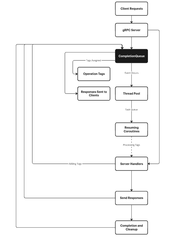 In the final phase of gRPC implementation, handling a CompletionQueue tag is straightforward. The process involves iterating through by calling Next until the function returns false, indicating the server or queue shutdown. After getting a new tag, the next step is to search the map<Tag*, std::shared_ptr<Awaitable>> (map need to be a thread safe!) and find an awaitable for a corresponding tag. Then complete it to resume coroutine. To resume the coroutine without blocking additional requests, it is essential to invoke complete on a thread pool, rather than the completionQueue thread.