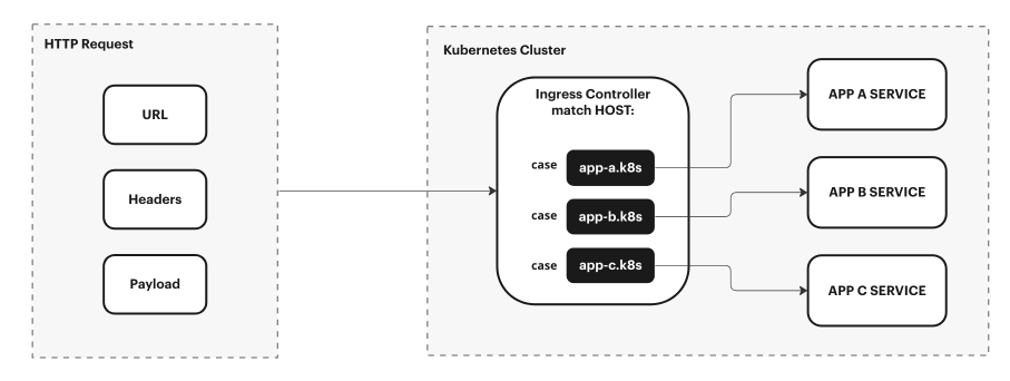 Let’s drop the topic of gRPC for a moment and take a look at how a simple HTTP request is transmitted to the Kubernetes applications. At first, the host given in an outgoing request must be configured to point to the cluster’s IP address (normally achieved by DNS entry). Then all incoming requests pass through a mechanism called an ingress controller. It can be simplified to a switch-case clause based on the request’s URI. Then if the host matches the provided configuration, the request is redirected to the target application running on the cluster.