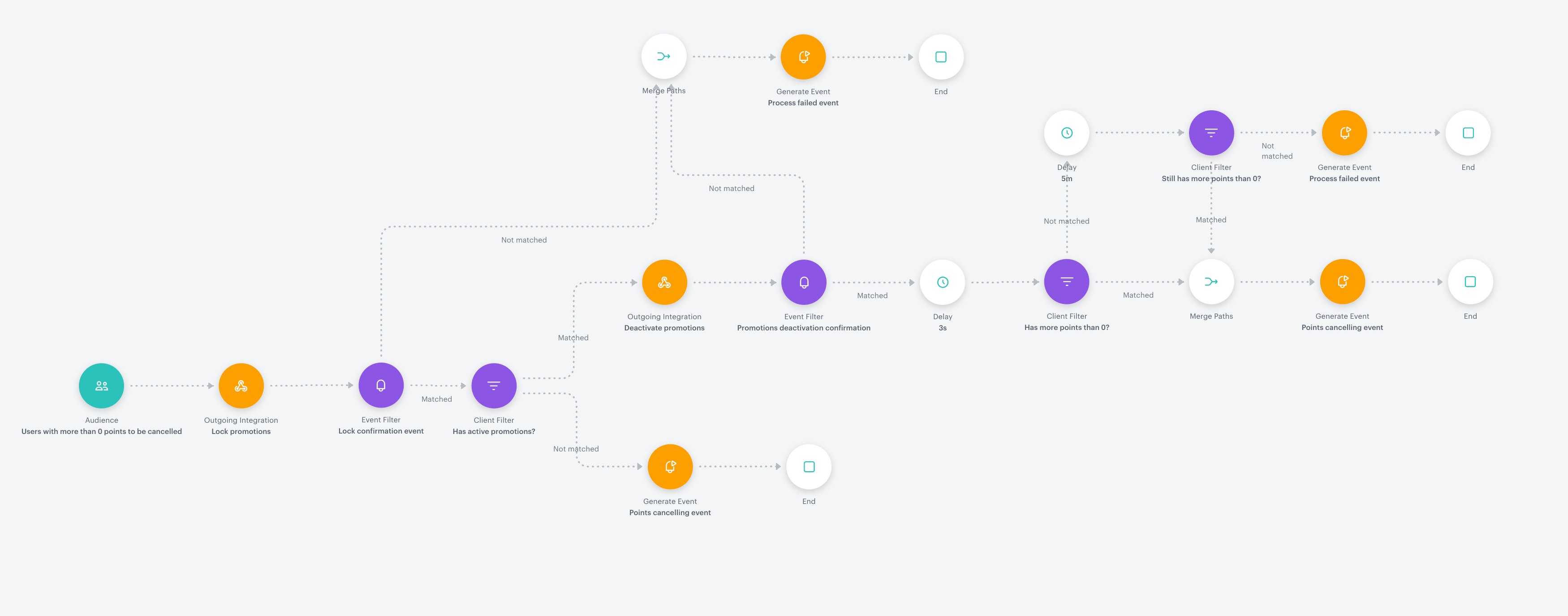- lock users’ point balance (which will automatically expire after a configurable time) for the duration of the process so that they cannot change it by manually activating and deactivating promotions, completing quests, etc. Before we proceed, we need to wait for an event that confirms the lock. If we do not receive such an event, we move users on the "fail" path and finish the journey. Later, we can easily find such cases, and both analyse the cause of the failure and collect them in the second round of the deletion process.