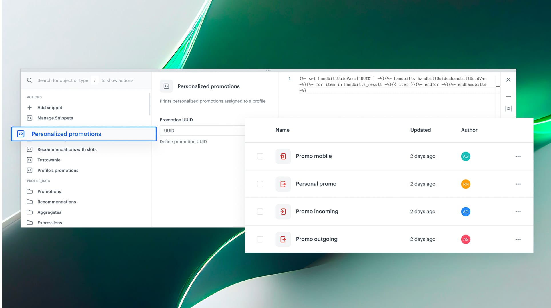 - Insert into campaigns – In any campaign builder or automation flow, select Snippets → Promotions → Personalized promotion, then copy the snippet code and paste the ID of your personalized promotion model.