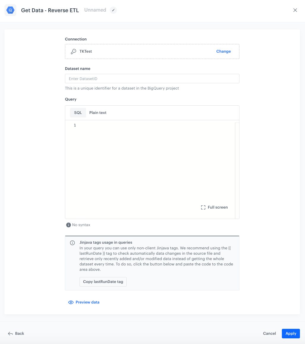 We have created a dedicated “Get Data - Reverse ETL” node, which enables pulling data from BigQuery to Synerise.