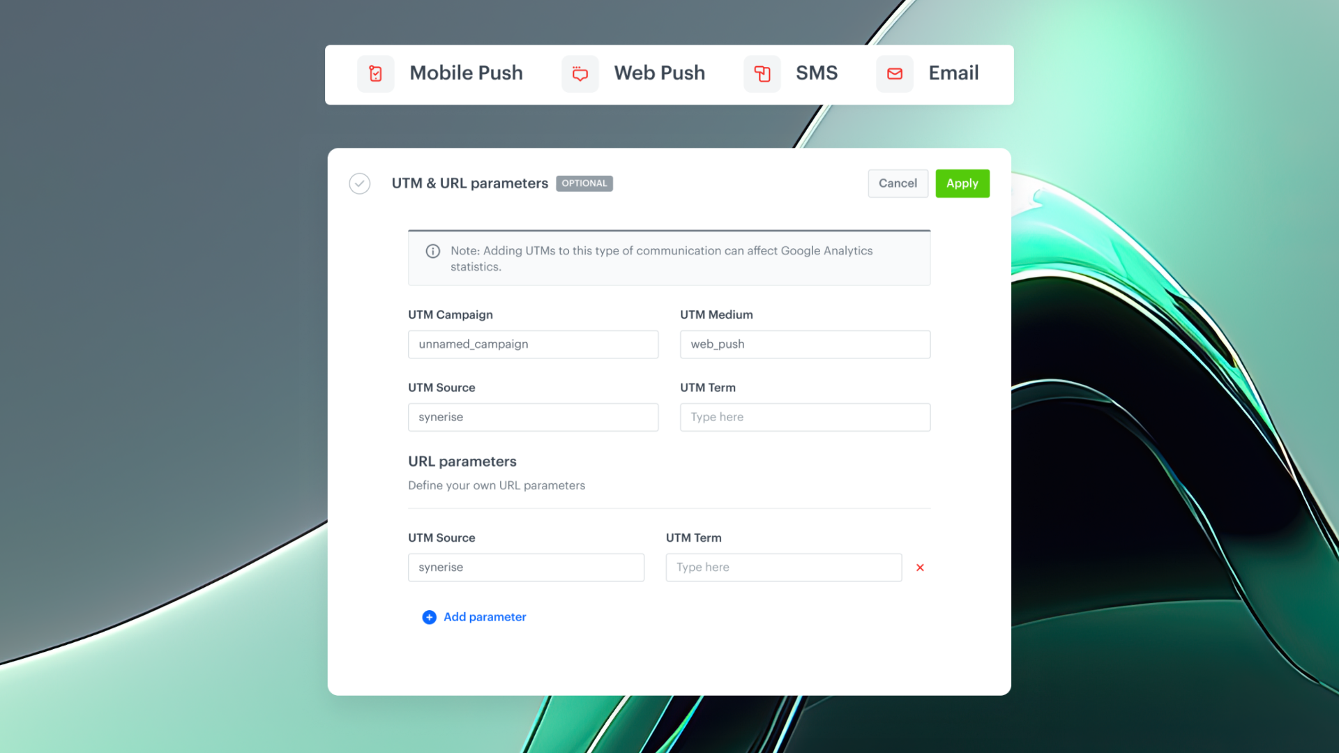 We’ve made a small but important UX improvement in campaign management. Starting now, UTM parameters can also be configured in SMS and Mobile Push campaigns—just like in Email and Web Push.