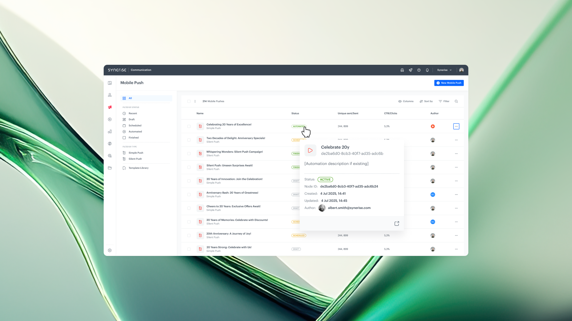 Campaigns created by Automation now display key contextual information in a quick-view pop-up accessible directly from the Communication list. You can instantly see the workflow’s current status, when it was created or modified, and by whom, all without leaving the page. Each entry also includes a direct link to open the workflow in Automation, so you can quickly review or edit the setup behind the campaign.
